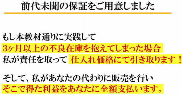 落合麻子と申します。あなたが本教材通りに実践して3ヶ月以上の不良在庫を抱えてしまった場合は、私が責任を取って仕入れ価格にて引き取ります!さらに私があなたの代わりに販売を行い、そこで得た利益をあなたに全額支払います。